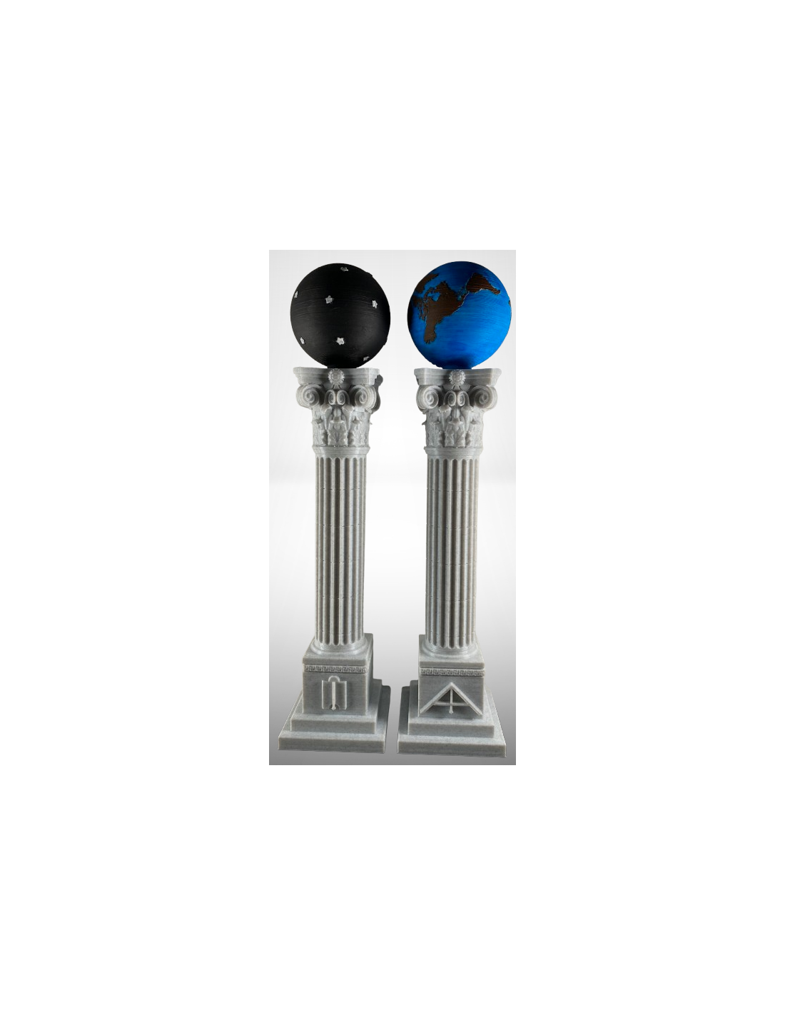 Les deux colonnettes surmontées d’un globe terrestre et d’un globe céleste font partie des outils symboliques et traditionnels de la franc-maçonnerie. En effet, ces colonnettes représentent les deux colonnes du Temple de Jérusalem, baptisées Jakin et Boaz. La fonction et l’emplacement de ces colonnettes Terrestre et Céleste varient considérablement en fonction de chaque Rite. Hautes d’environ 35 cm, ces colonnettes conviennent aux maisons du Rite Écossais Ancien et Accepté ou REAA et au Rite Standard d’Écosse. Ce jeu de colonnettes Terrestre et Céleste peut également être utilisé par les maisons du Rite Français et du Rite Émulation.