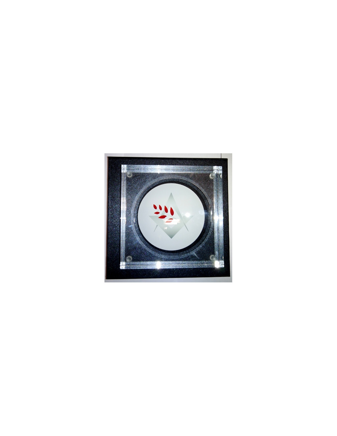 Au centre de ce vide-poche en verre logo GL-AMF se trouve le logo de l’Alliance, composé d’un compas et d’une équerre croisés. Une feuille d’acacia de couleur bordeaux se trouve au milieu. Ce logo se trouve dans deux cercles blancs. Le tout a été réalisé avec de l’impression numérique. Pour préserver ce vide-poche en verre logo GL-AMF, nous prenons soin de le livrer avec son coffret.