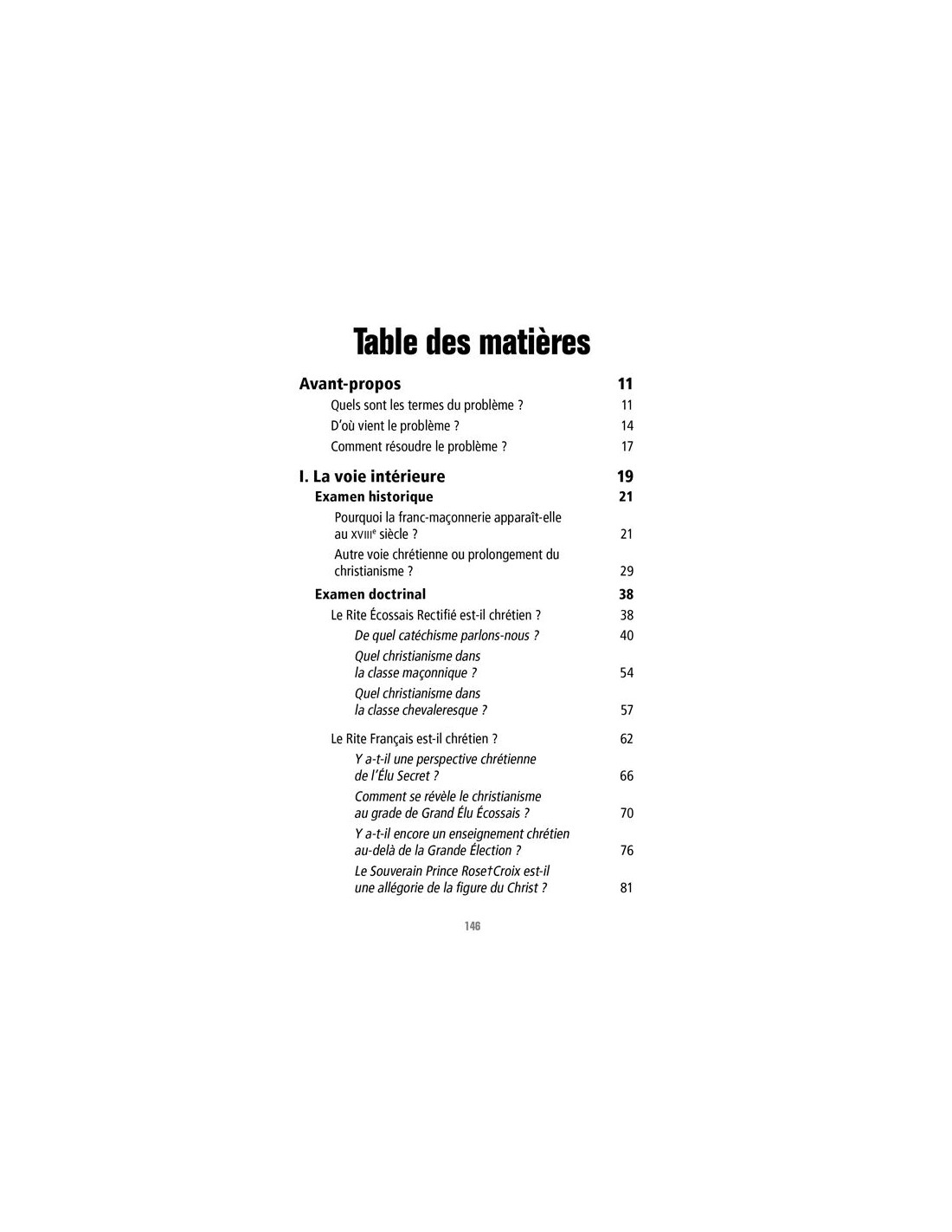 Nombre d’ouvrages sur la question, la plupart à charge contre la franc-maçonnerie, ont pris le problème de travers, en biaisant l’équilibre du rapport dans une inévitable asymétrie. Ceux émanant de fidèles de l’Église de Pierre, quand ce n’est pas d’ecclésiastiques, contre la maçonnerie ; ou ceux écrits, souvent en réaction, par des maçons contre la cléricalisation de la foi et dont les convictions s’en sont trouvées meurtries. Chaque fois, il s’agissait d’écrire « contre », plutôt que de concilier. Le présent travail n’a certes pas la prétention d’une telle réconciliation, mais il a la vertu de chercher à comprendre les dessous du litige et de définir un peu plus qu’un terrain d’entente.