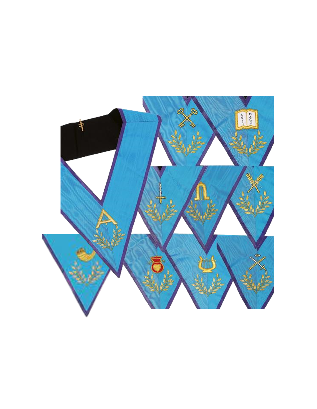 Sautoirs / Colliers d'Officier RAPMM lot de 10 Pieces TISSUS MOIRE / SOIE BLEU TURQUOISE LISERE VIOLET SYMBOLES DE CHARGE + ACACIA BRODES HAUTE DENSITE AUX FILS DOR ET DE COULEURS DOS NOIR + CRANE, OS et 9 LARMES ATTACHES COL et BIJOUX DORES
